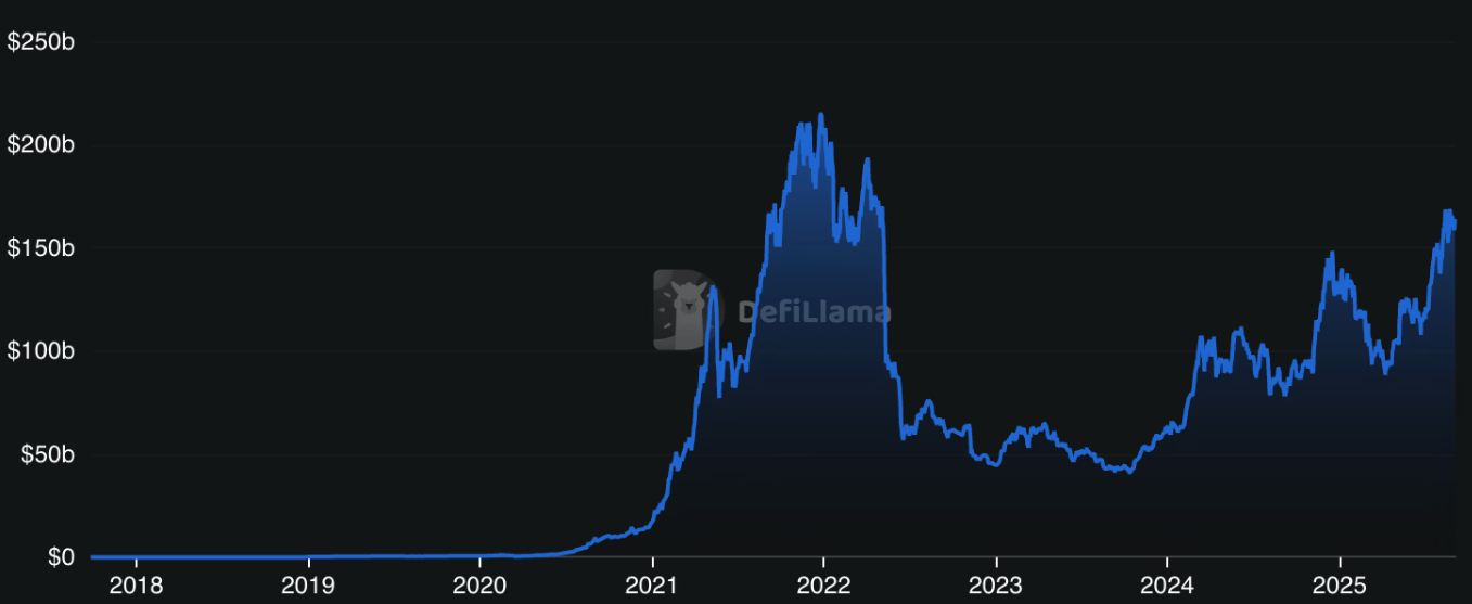 到2025年中,DeFi不再像是一个狂野的实验,或是一个仅在牛市期间登上头条的流行语。锁定总价值(TVL)回升至数千亿美元,多个追踪器显示2025年第三季度TVL超过1600亿美元。