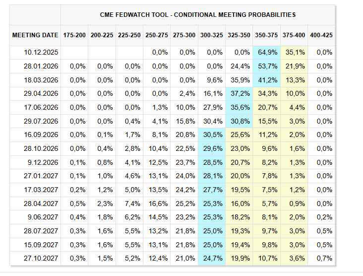 目前市场预期12月10日利率决议降息25个基点的概率为64.9%。