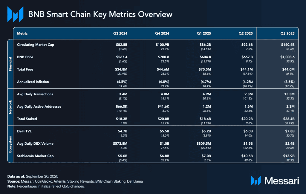 Reth客户端和Builder API等基础设施升级通过减少MEV提升了网络速度。2025年第三季度伊始,BNB链在提升市值和使用量方面实现全面增长。BNB市值增长51.6%至1404亿美元,价格突破1000美元,超越Solana位列比特币、以太坊、USDT和XRP之后的第四名。
