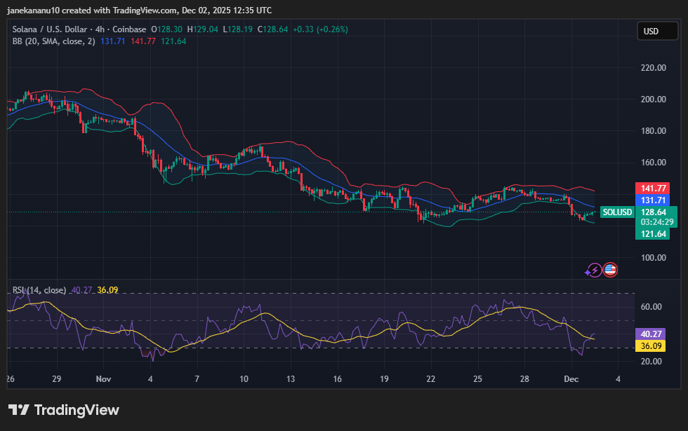 根据TradingView的4小时图,Solana价格在触及布林带下轨121.64美元后反弹。布林带位置表明SOL当时已处于超卖区域。