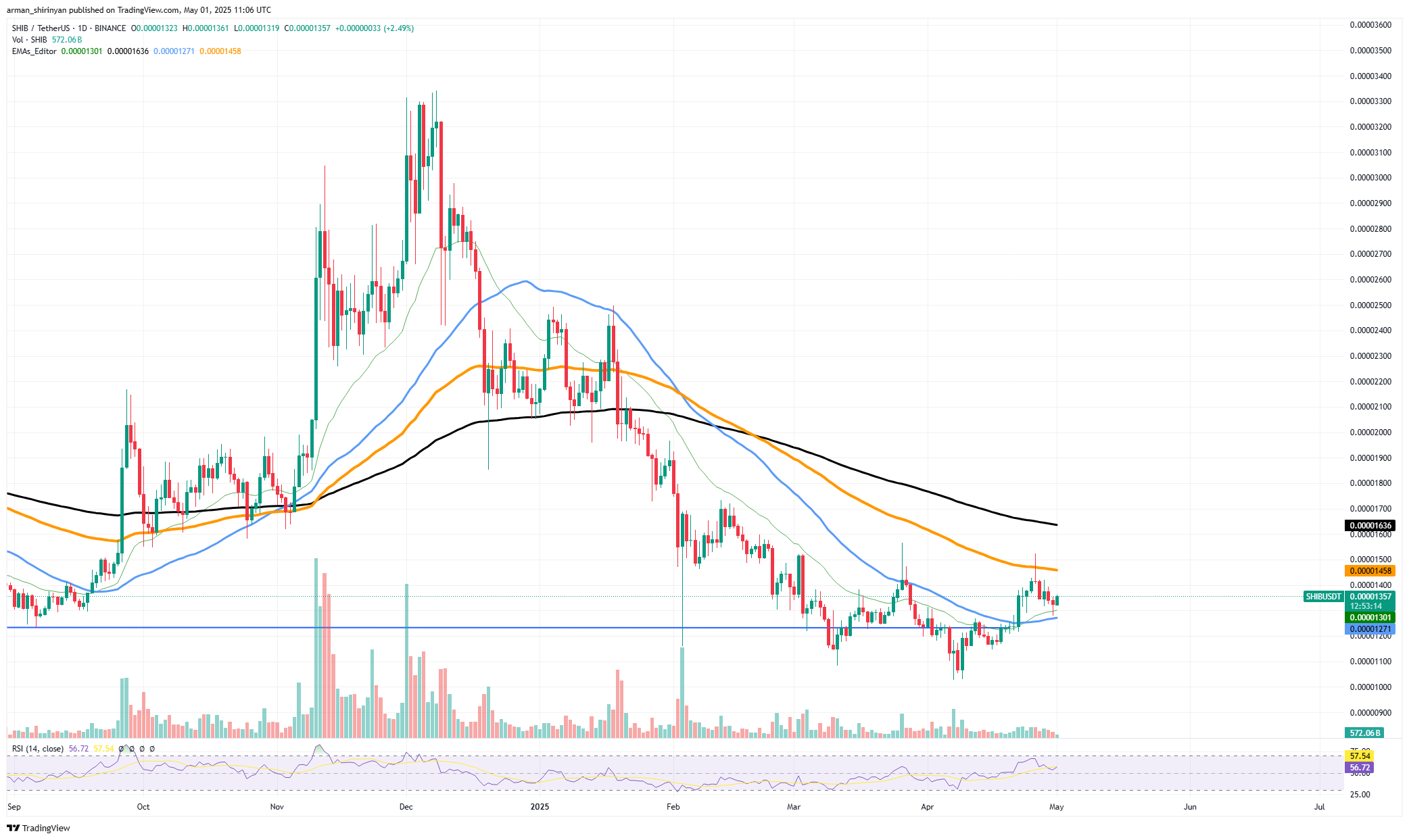 在多头试图重拾势头的背景下,柴犬币(Shiba Inu)近期经历了显著的短期上涨,在高成交量活动中增加了超过5100亿枚代币。在从0.0000127美元的局部支撑位回升后,SHIB目前交易价格约为0.00001355美元。在过去24小时内上涨约2.34%,目前正面临0.00001458美元的阻力位,该位置略低于100日指数移动平均线(EMA)。