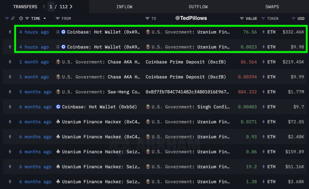 分析师TedPillows披露,美国政府近期通过Coinbase热钱包获得76.56枚以太坊(价值332,460美元),这些资金与Uranium Finance案件有关。