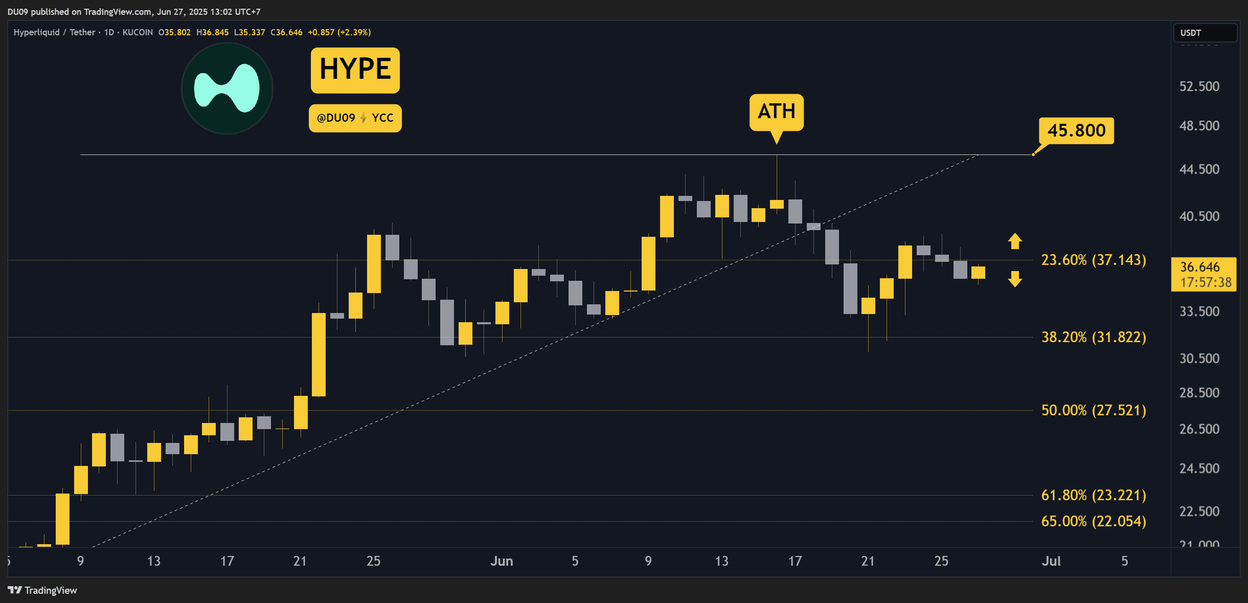 本周微跌1%,看似波动有限,但若无法在近期确立37美元支撑位,下行趋势恐将持续。该代币6月初创下46美元历史高点后进入调整阶段。若价格回落至35或32美元支撑区,可能重现历史买盘介入场景。理想情况下,HYPE需形成更高的低点结构,继而重返40美元上方。值得注意的是,当前价格已较历史高点回调32%,深度调整后再度破底的可能性较低,但若发生,则可能下探30美元下方。