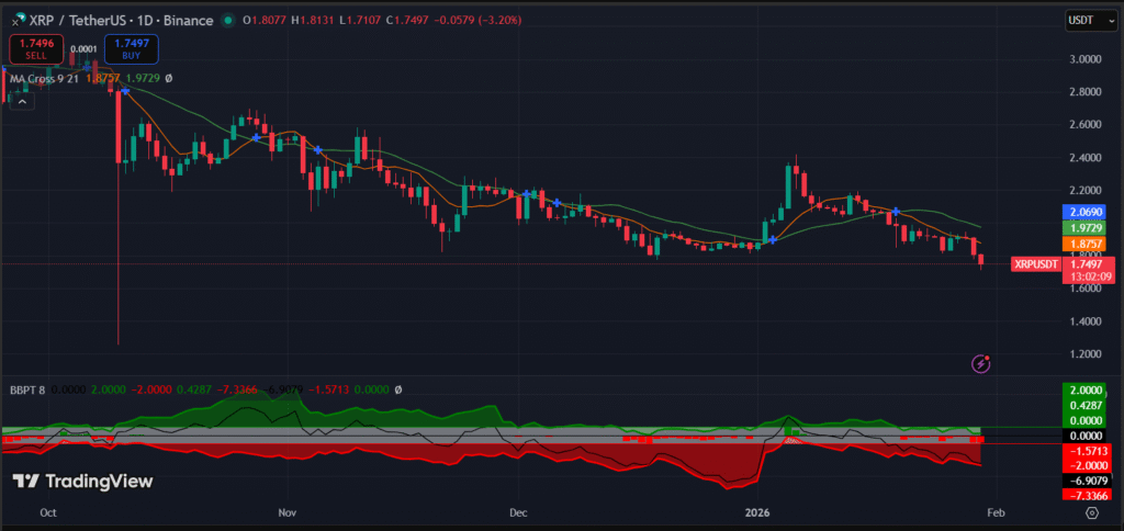 在日线时间框架上,XRP持续在下降通道内运行,该形态自去年十月以来一直延续。每次反弹尝试均形成更低的高点,而回调则持续试探更低价格区域。近期走势显示价格位于9日与21日移动平均线下方,表明短期趋势压力仍偏向下行。
