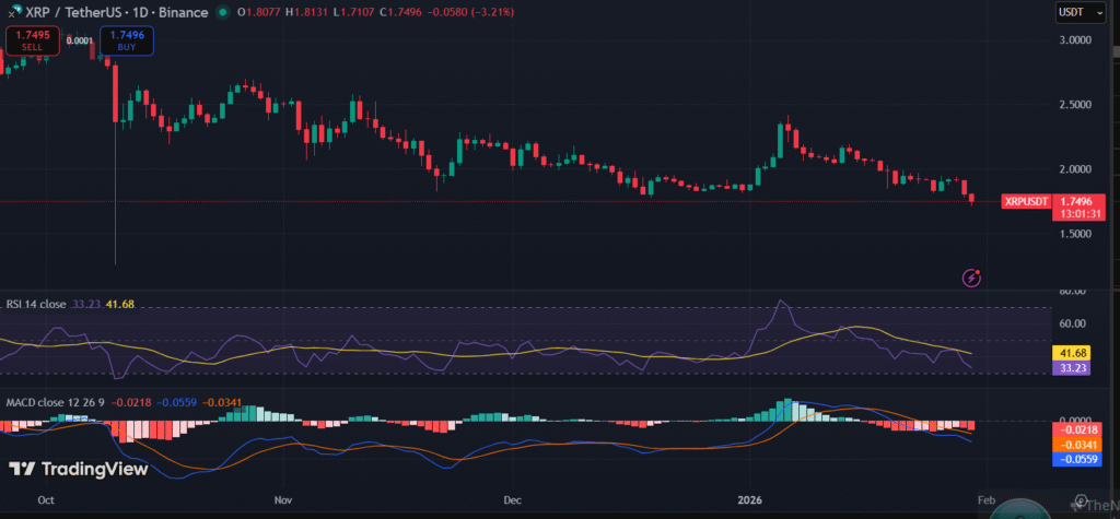 随着加密货币市场的整体疲软以及比特币的持续下跌给山寨币带来压力,XRP已跌破1.75美元关口。技术指标与价格结构显示,XRP仍处于短期下跌趋势中,当前支撑位在1.70美元附近,阻力位则位于2.00美元下方。