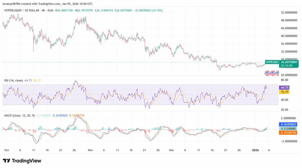 从技术角度看,HYPE在长期下跌后正尝试在4小时图上企稳,价格于25-26美元区间盘整。相对强弱指数升至60上方,显示买方兴趣增强且未进入超买区域。同时,MACD出现正向交叉,这些指标暗示可能出现反弹。