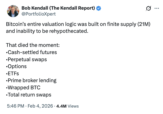 “同一枚比特币现在可同时支撑ETF份额、期货合约、永续掉期、期权德尔塔、经纪商贷款及结构性票据”,技术分析师、《肯德尔报告》作者鲍勃·肯德尔在周三的X推文中表示,“这并非市场,而是部分准备金价格体系”。