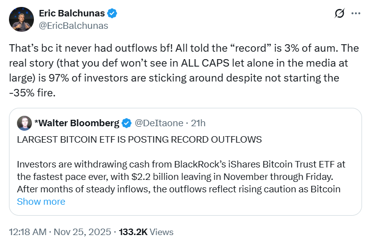 Balchunas认为这才是真正的关键信息,而非夸张的撤退叙事。此外他指出,大多数IBIT投资者并未推动比特币价格下跌。