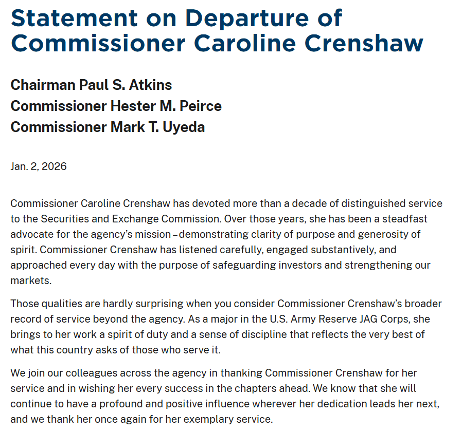 担任美国证券交易委员会委员的卡罗琳·克伦肖已于2026年1月2日正式离职。她的离任将改变由另外三位委员进行的加密货币监管决策进程,因为克伦肖原是SEC内部对加密货币最坚定的反对者。
