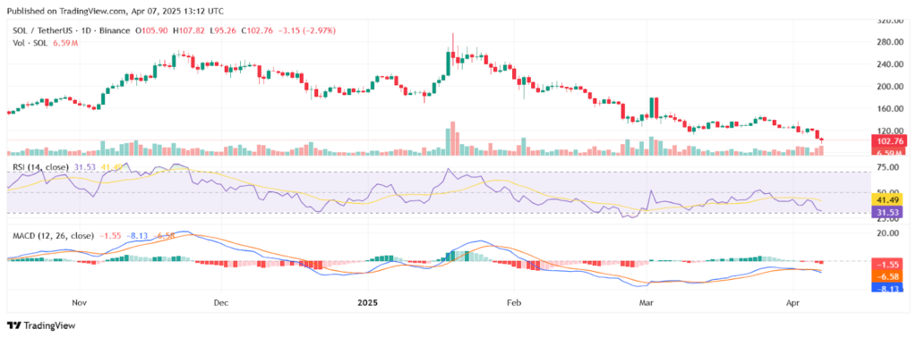 新的一周看起来颇为黯淡,Solana(SOL)价格和其他加密货币纷纷录得自由落体式下跌。特朗普关税风波不仅影响了加密货币和山寨币,也波及了传统金融市场。SOL已损失其价值的16.27%,交易价格跌至100.32美元,显示过去一年其价值跌幅超过40%。在熊市压力和更广泛的市场及比特币价格走势的拖累下,Solana价格持续下跌。