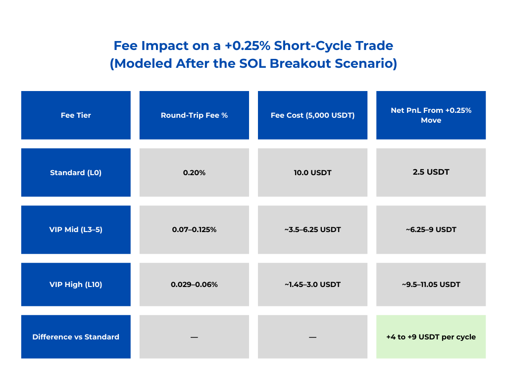 日内微幅波动创造了主动交易的大部分机会,即使通过简单模型也能看出执行成本如何影响最终结果。以5,000 USDT的入场头寸(短周期策略的中等合理规模)为例,捕获+0.25%的微幅波动可产生12.5 USDT收益。但按主流交易所平均现货费率0.1%计算,双向手续费将扣除10 USDT(5,000×0.1%×2),最终净利润仅剩2.5 USDT。即使策略判断准确,行情如期而至,大部分收益却无法体现在盈亏线上——因为基础设施在交易者看到结果前就已抽走分成。