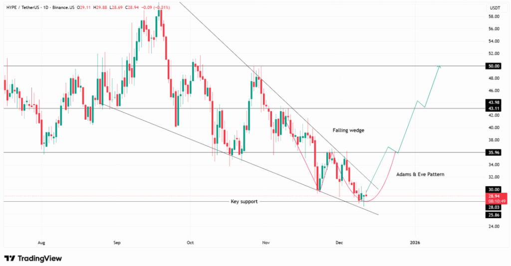图表显示经过持续卖压后形成的明确下降楔形。HYPE沿楔形支撑形成更高低点,表明买方控盘能力增强。此外,该形态与亚当夏娃结构的右侧相似,通常支撑渐进式趋势转换。