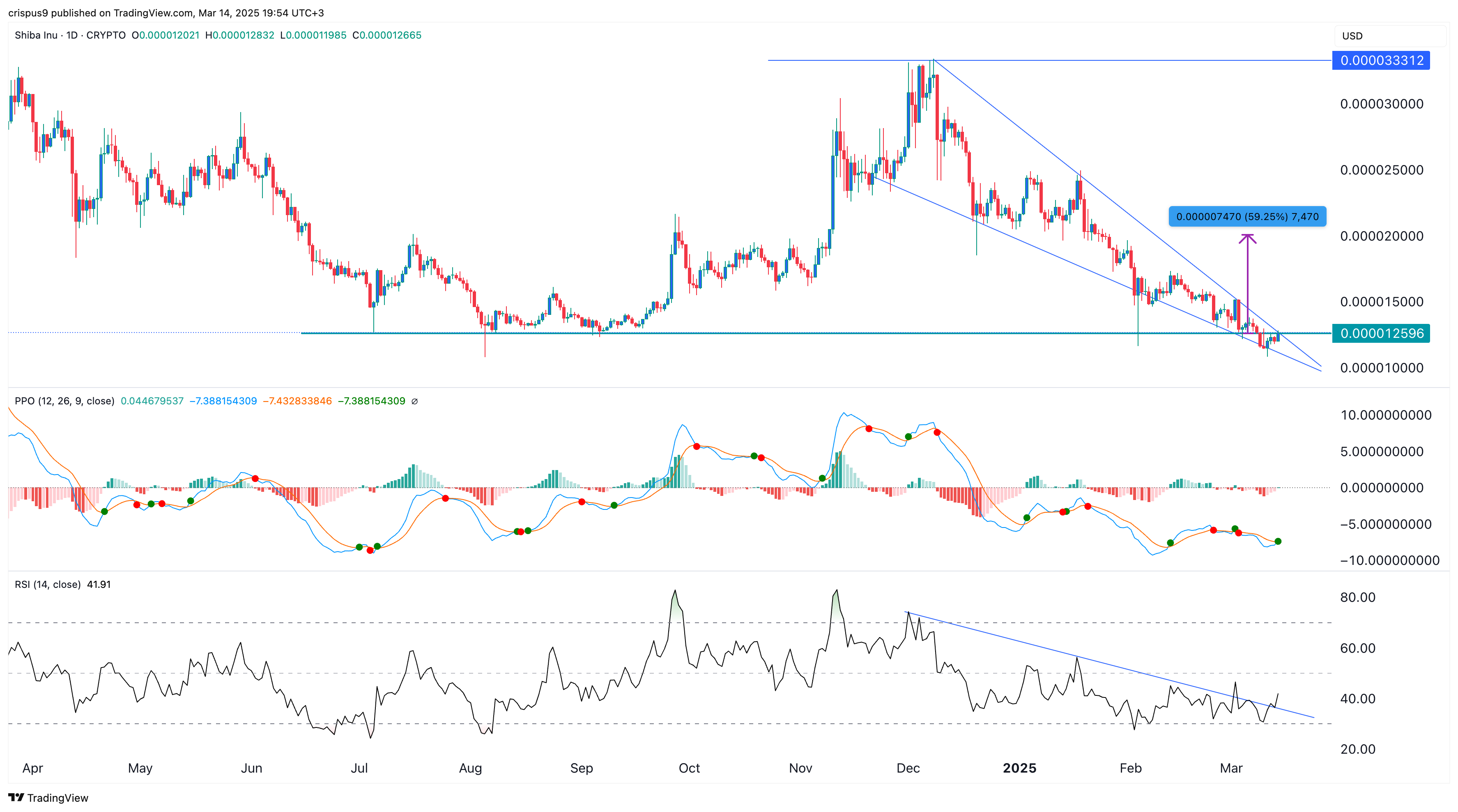 技术指标表明,SHIB今年可能会迎来强劲的看涨突破。日线图显示,Shiba Inu一直在形成一个下降楔形形态,其特征是两条下降且收敛的趋势线。