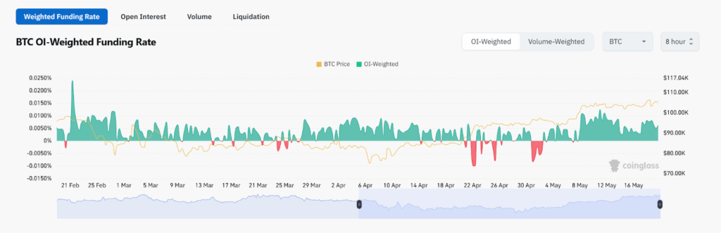 多项指标表明,比特币可能会继续上涨,这与巴尔丘纳斯的预测一致。比特币资金费率在5月转为正值。CoinGlass的数据显示,多头头寸的需求有所增加。在4月跌至负值后,资金费率已恢复,表明随着比特币达到10万美元,购买量增加。