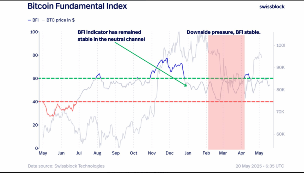 此外,Swissblock的链上分析表明,当前的市场状况并未显示出一些交易者担心的看跌双顶形态。“BFI讲述了一个不同的故事:没有看跌背离的迹象……即使在2月至3月的回调期间,它也保持中性。”该公司分享道。这种中性至强劲的链上情绪与资金费率数据一致,并为比特币价格继续上涨的预测增添了信心。