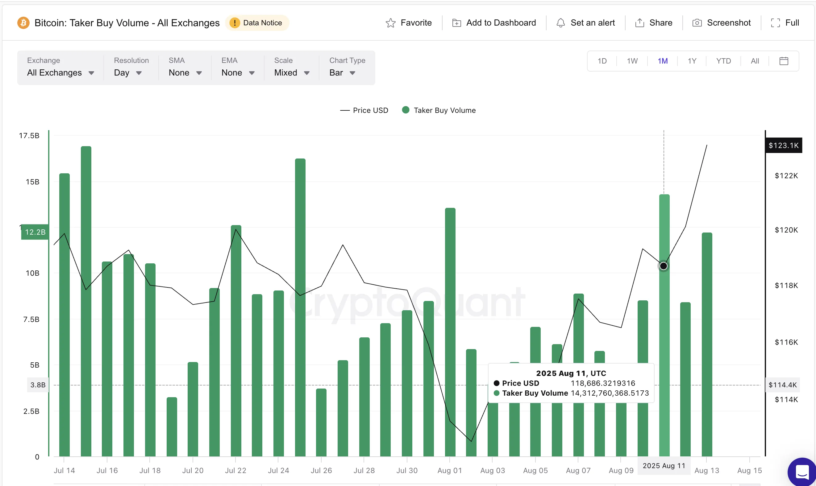 8月11日突破尝试失败期间,Taker买单总值(消耗卖盘流动性的市场买单名义价值)飙升至143.1亿美元。核心逻辑在于:市价买单必须"吃掉"订单簿中的现有卖单才能成交——这意味着买家正以卖方报价即时承接,而非等待回调。