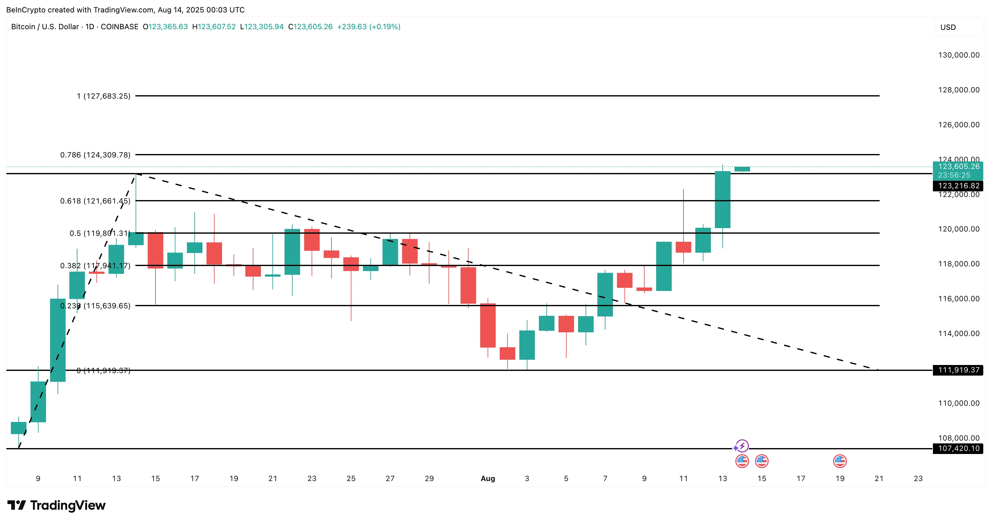 随着多头完全掌控势头,124,300美元成为测试短期强度的最后关键阻力。若日线能站稳该位置上方,则有望打开通往127,600美元的通道(1.0斐波那契扩展位对应的下一主要目标)。