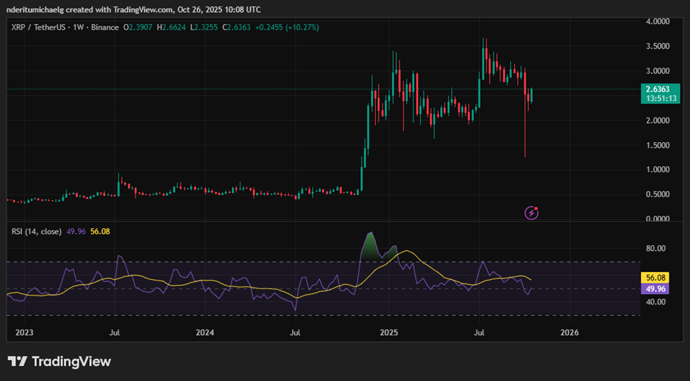 周线图表显示XRP近7日涨幅超10%,主要得益于周末的强势拉升。截至发稿时,XRP价格维持在2.63美元上方,其市值占比亦飙升至4.22%。此次反弹使XRP成为市值前十加密货币中表现最佳者,甚至超越比特币、以太坊等头部资产。