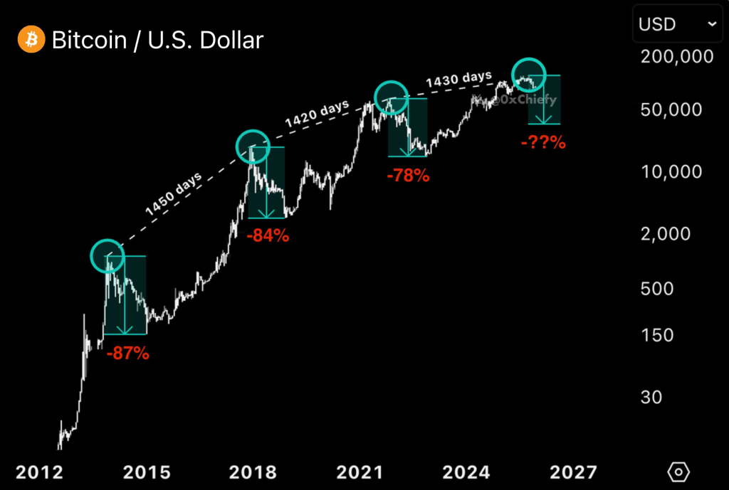 Chiefy的图表回顾了自2012年以来的每个主要比特币周期。每个周期中,比特币价格见顶后都会经历持续约1400至1450天的残酷回调,随后才形成重要低点。这些下跌幅度均不容小觑——在过往周期中,比特币从高点下跌78%至87%后才最终企稳。