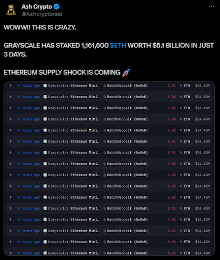灰度2025年最大以太坊质押行动:三天锁定116万枚ETH