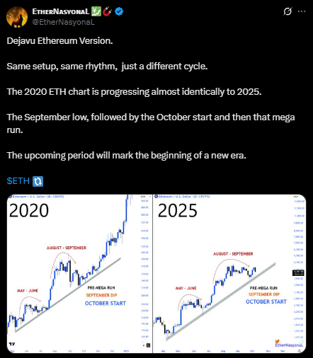 多名交易者将当前结构与以太坊2020年走势对比。当年10月初价格下跌后,年底前实现加速上涨。分析师指出两个时期的相似性:早期下跌、机构兴趣增加,以及市场对季节性走强的普遍预期。灰度选择此时质押尤其值得关注,因为如此大规模的操作通常需要周密规划。