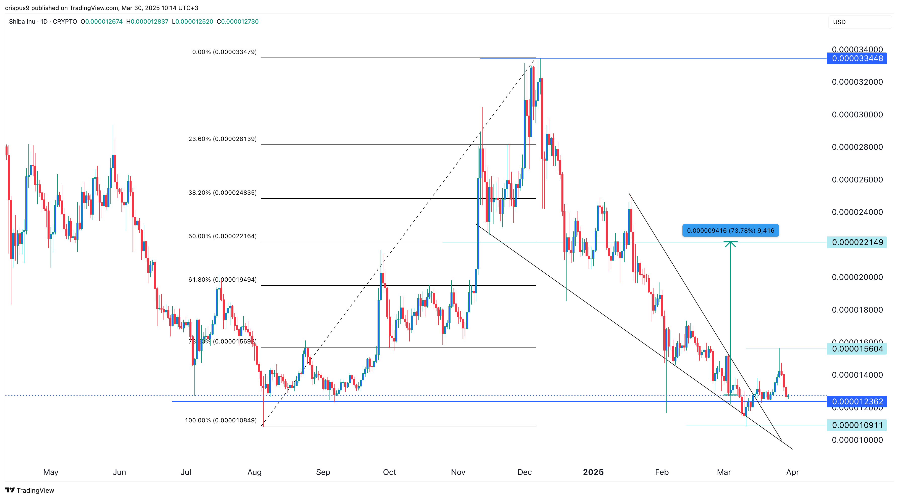 Shiba Inu价格在日线图上形成了一个巨大的下降楔形模式。因此,该代币可能会在未来几周内反弹。如果价格突破0.00001560美元的关键阻力位(即3月26日的最高摆动点),则可能进一步上涨。