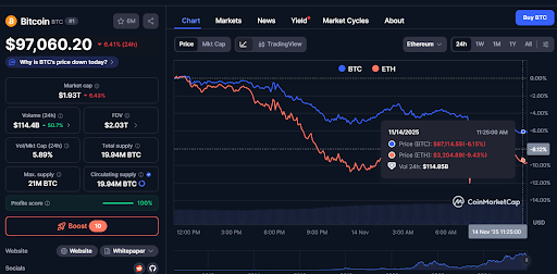 截至发稿时追踪数据显示,比特币现价97,114.55美元,跌幅6.15%;以太坊价格跌至3,204.89美元,跌幅达9.43%。