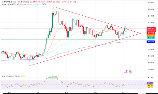 XRP当前价格维持在3.03美元,从上周低点2.85美元强劲反弹,暗示趋势可能转变。随着SEC将于10月18日开始审查多份XRP ETF申请,这一关键事件或将决定其未来走势。根据TradingView数据,XRP现处于对称三角形末端,阻力区间3.15-3.20美元与2.85美元支撑位形成技术边界。20日与50日指数移动平均线(EMA)分别在2.94美元和2.93美元构筑价格基础,而200日EMA(2.62美元)则确保长期看涨趋势未改。