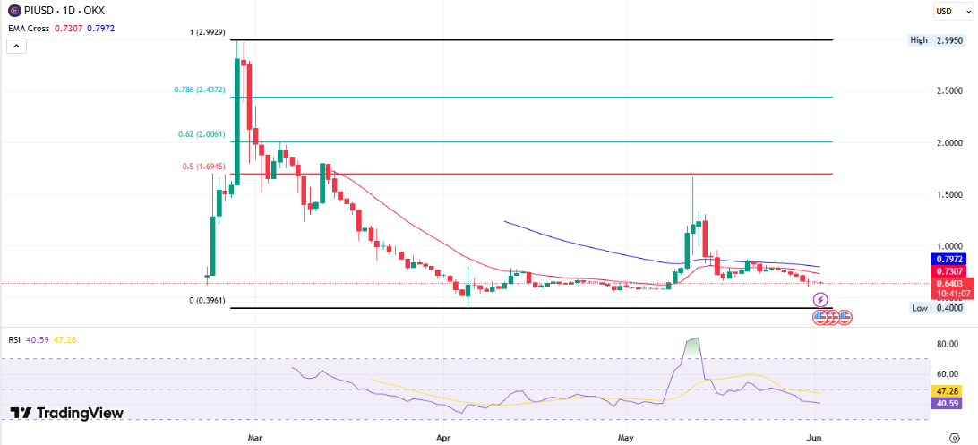 技术分析工具同样为PI加密货币描绘出黯淡前景,而近期PI网络价格下跌的另一重要原因在于即将到来的代币解锁。自五月中旬以来,其价格已下跌超过60%,过去几天更是持续走低,日线未现一根阳烛。面对如此强劲的下行压力,分析师预测PI币可能进一步下探至0.4美元。