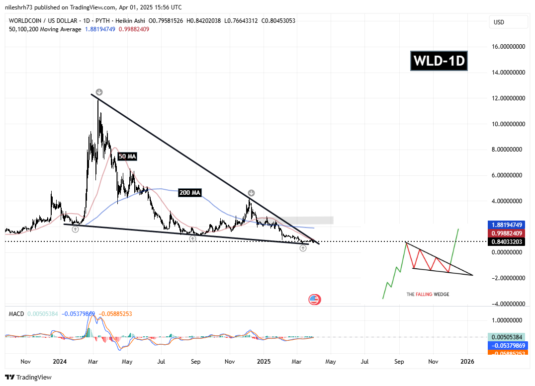 WLD的日线图显示出一个典型的看涨反转形态——下降楔形,该形态已形成近一年时间。从12月初4.18美元的高点开始的回调,使WLD下跌超过85%,并在3月11日触及0.72美元的低点。这一关键支撑位吸引了买盘,暗示可能出现趋势反转。
