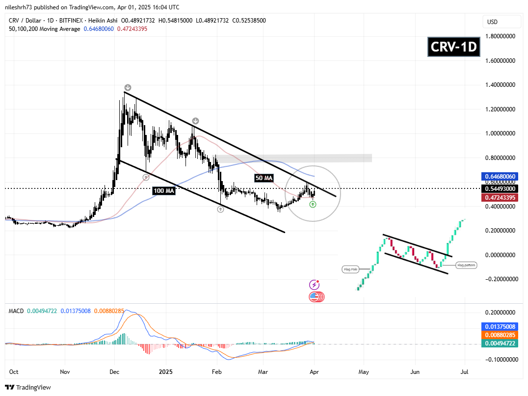 目前,CRV已回升至0.54美元,正在测试200日均线,并逐渐接近旗形上轨阻力。若突破该形态并确认回踩,可能会为挑战100日均线和0.8274美元阻力区域铺平道路,意味着较当前水平有49%的潜在涨幅。