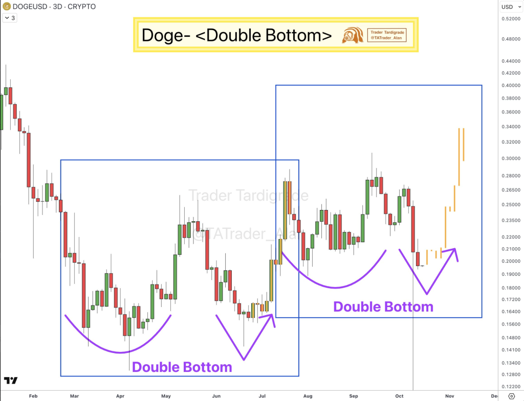 分析师TATrader Alan指出,狗狗币在三日图表中显现潜在双底形态,该形态由0.16-0.18美元区间的两个对称低点构成,若确认突破则可能上行至0.30-0.33美元。