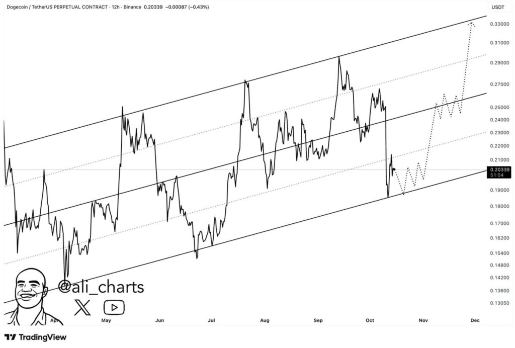 分析师Ali补充指出,12小时图表显示狗狗币仍处于上升平行通道内。若守住0.19美元支撑,可能进一步上探0.25美元、0.27美元及通道阻力位0.33美元。