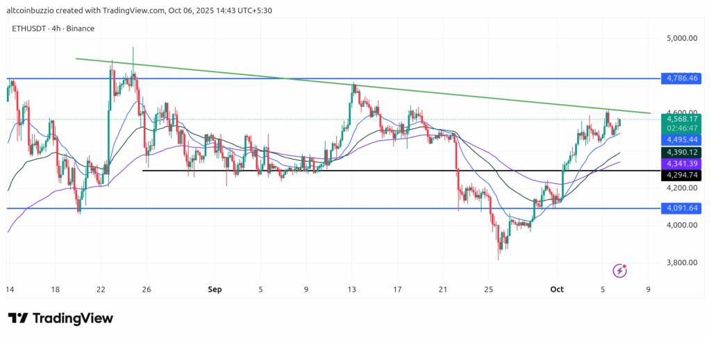 EMA50位于4600美元,EMA100位于4550美元,当前价格4570美元。通过对比这些数值判断趋势方向。