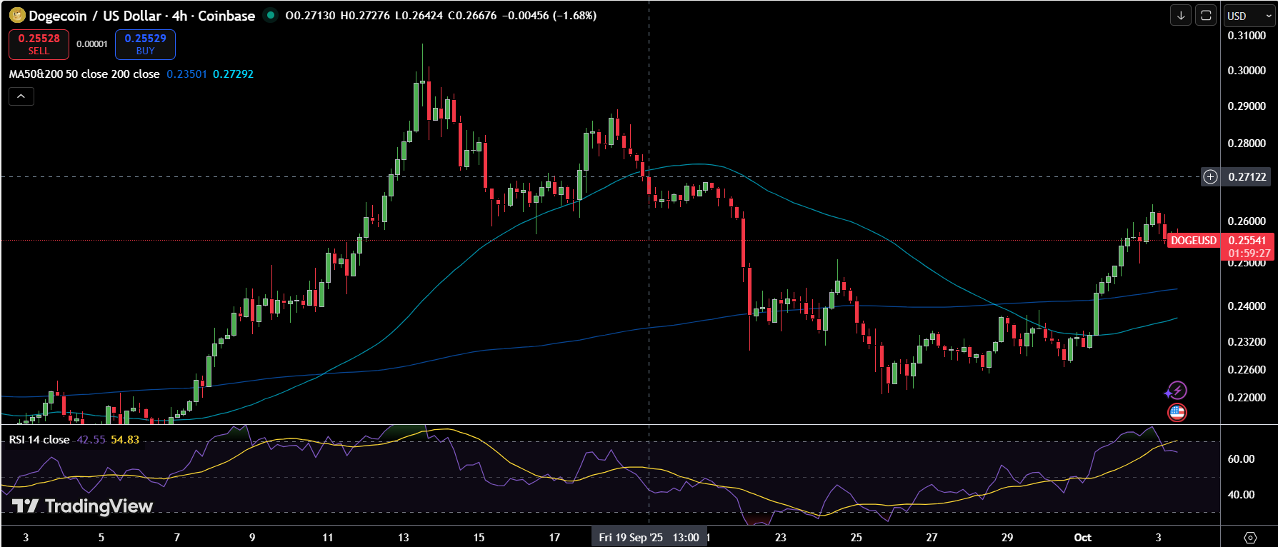 当前狗狗币价格徘徊在0.26美元附近,过去24小时微跌0.15%-0.8%。此次短暂回调出现在DOGE经历大幅上涨之后。分析师指出,尽管部分技术指标显示看跌信号,但推动近期上涨的动能或将持续支撑价格上行。