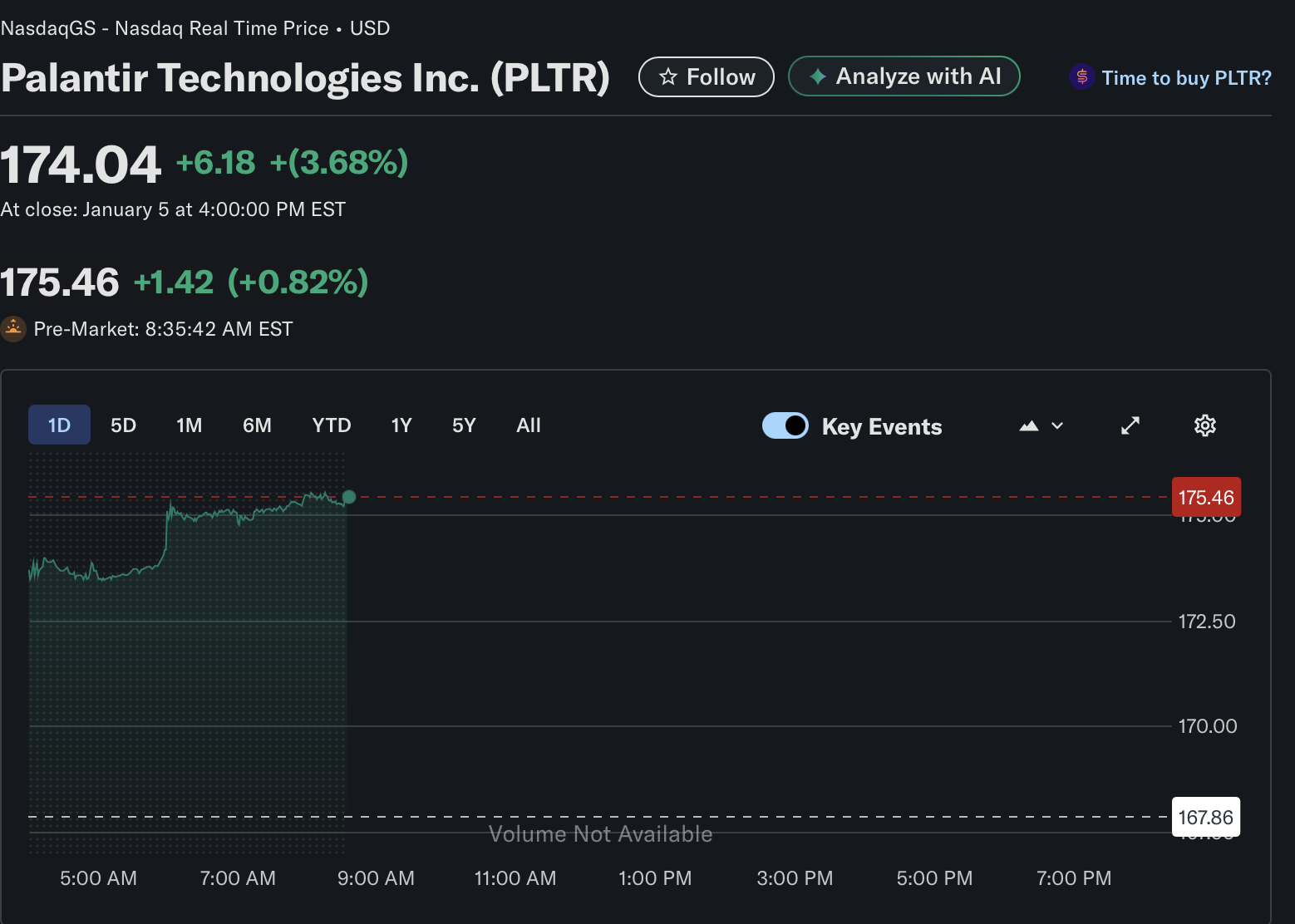 积极势头延续到了1月6日的早盘交易。截至美国东部时间上午8:35,在盘前交易时段,PLTR的交易价格为175.46美元,进一步上涨了1.42美元,涨幅为0.82%。盘前价格推动该股超过了前一交易日的收盘价,预示着在开盘前市场兴趣持续。