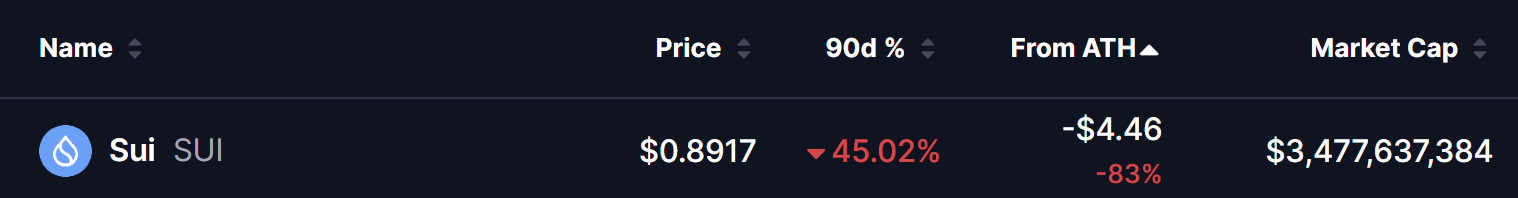 截至当前,SUI交易价格约0.89美元,较过去90日下跌45%,较历史高点回落约83%。该代币目前市值约34.7亿美元,尽管近期表现低迷,仍位居大型第一层区块链项目之列。