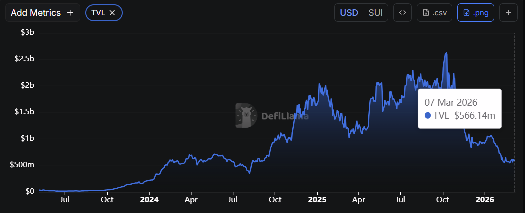 动能减弱的主要指标体现在Sui生态系统总锁定价值(TVL)的急剧下降。根据DefiLlama数据,Sui的TVL在2025年10月曾达到约26.3亿美元的峰值,但截至2026年3月,该数值已急剧下降至约5.66亿美元。