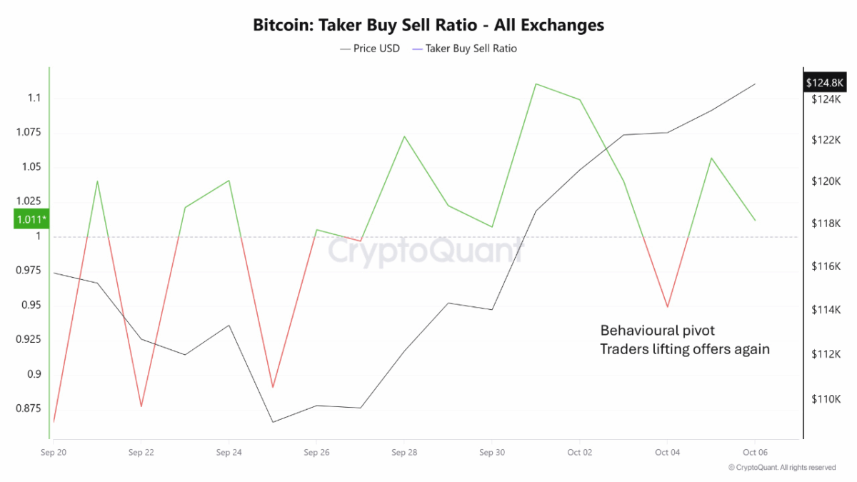 回溯9月底时该比率曾低于1,意味着卖方占据优势。如今形势逆转,交易者正在按现价买入而非等待更低点位。这通常是短期内价格可能延续上涨势头的积极信号。