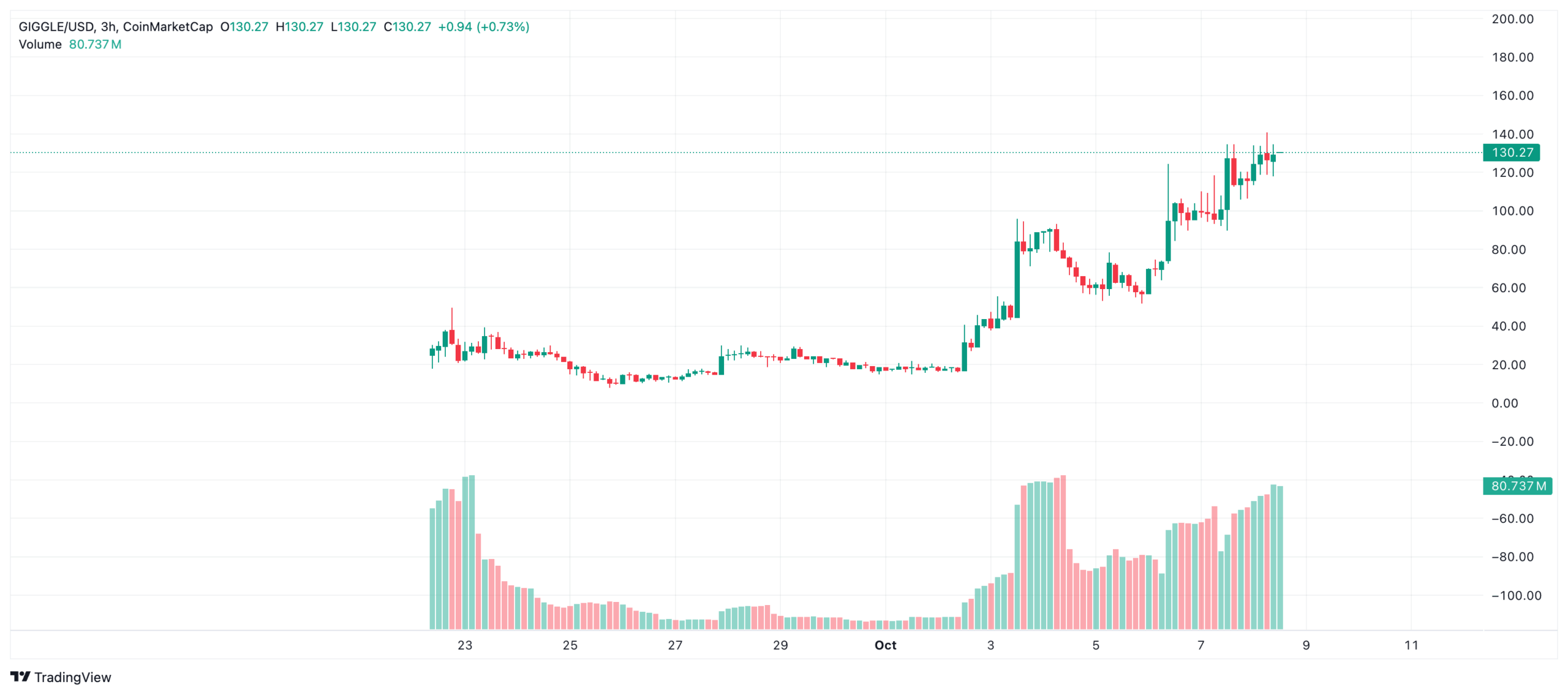 随着币安联合创始人兼前首席执行官赵长鹏在其社交媒体账号发文,GIGGLE和4等模因币迎来历史性暴涨。这场狂热导致去中心化交易所(DEX)趋势榜单快速更迭,交易量翻倍的同时价格急速攀升。具体而言,GIGGLE过去24小时飙升33.5%,触及140美元峰值,周涨幅达717%;而4代币单日上涨19%,周涨幅达349%。