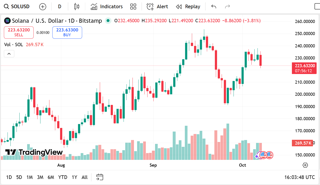 Solana目前交易价格约为223.63美元,过去24小时下跌0.76%,市值达1262.7亿美元,交易量为77.2亿美元,增长29.5%。尽管存在小幅波动,该网络强大的开发者活动和高效率持续吸引投资者信心。