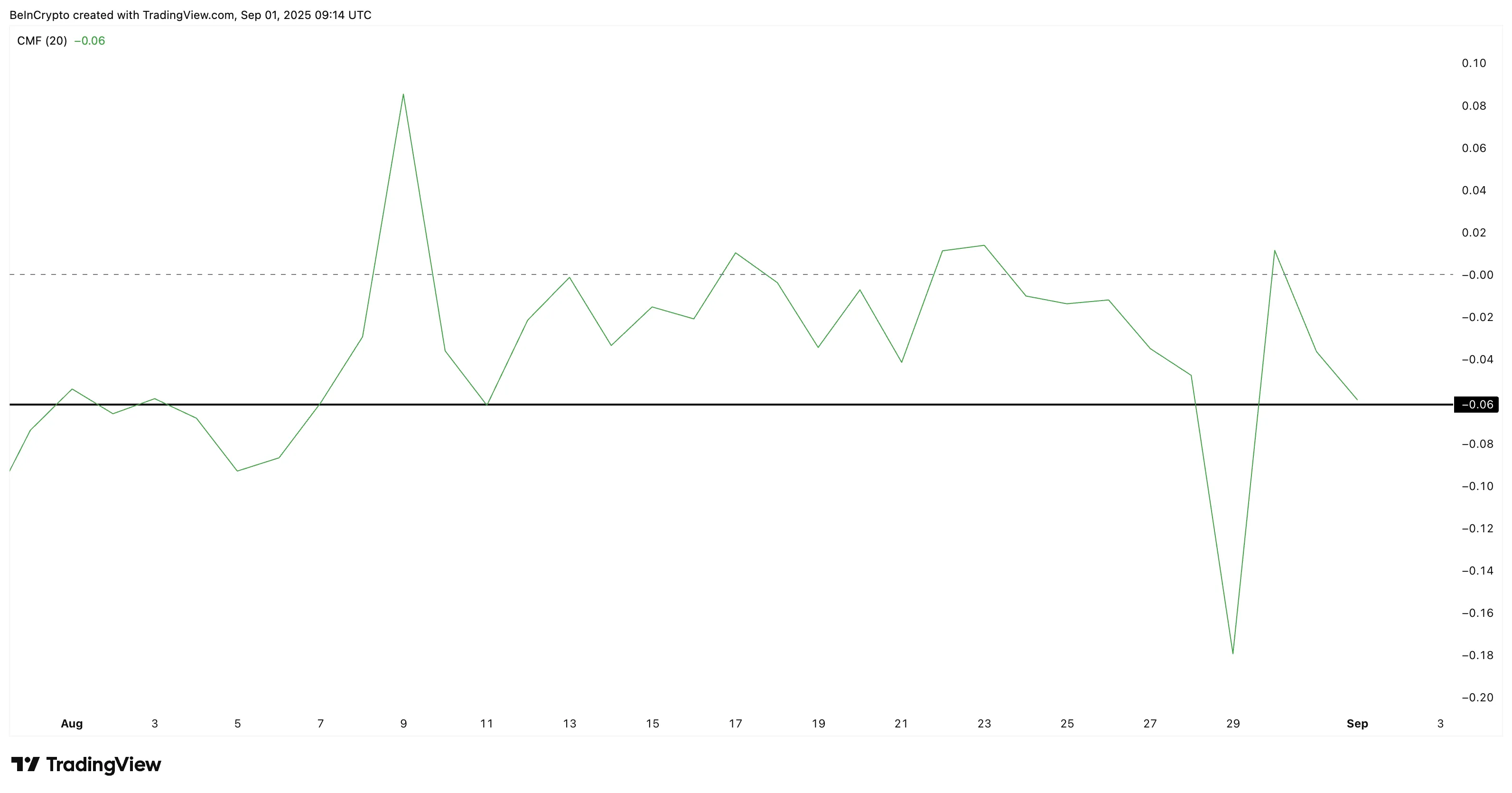 衡量资金流入/流出的Chaikin资金流量指标(CMF)在Pi币从0.32美元反弹至0.39美元时曾短暂突破零轴,显示买盘介入。但当前该指标已跌至-0.06,接近8月11日低点,表明资金流入枯竭,卖盘重新掌控市场。