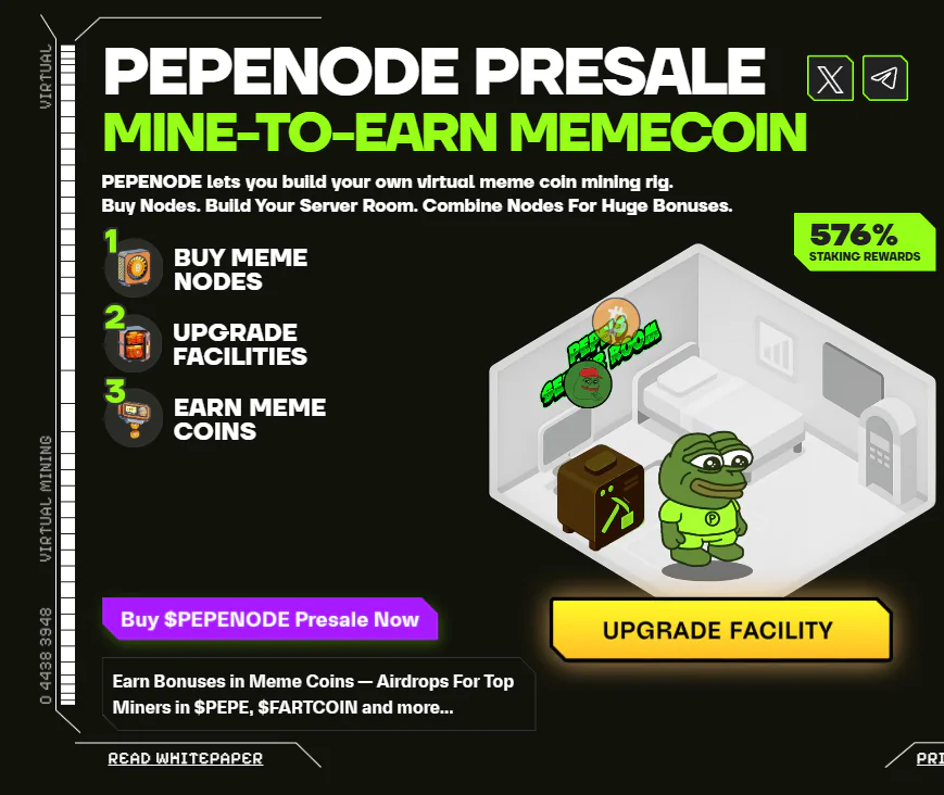 这正是PEPENODE的切入点。作为全球首款“挖矿即收益”meme币,它既延续了投机热潮,又用虚拟挖矿系统替代了算力与电费开销。