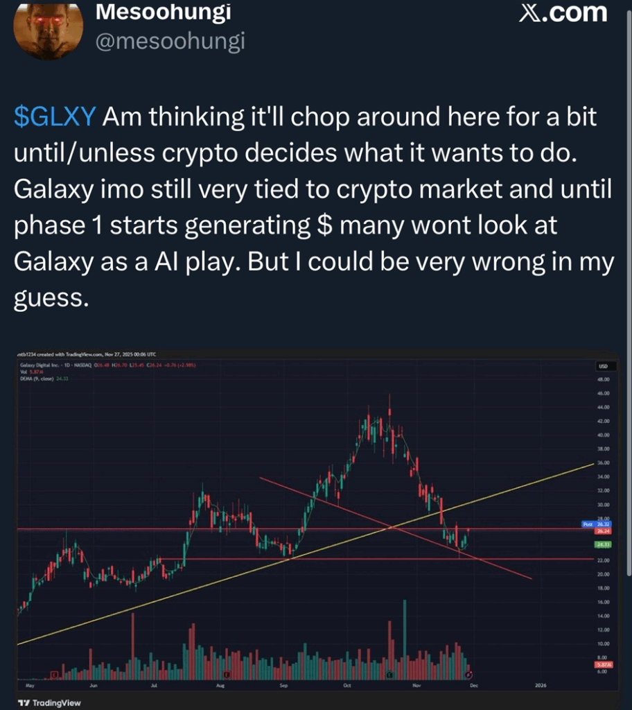 Galaxy Digital(GLXY)股价近一日上涨约3%,现交易于26美元附近。虽然全年累计涨幅仍超45%,但最近一个月表现疲软。许多交易者关注该股票能否重拾升势,或需等待更大利好刺激。