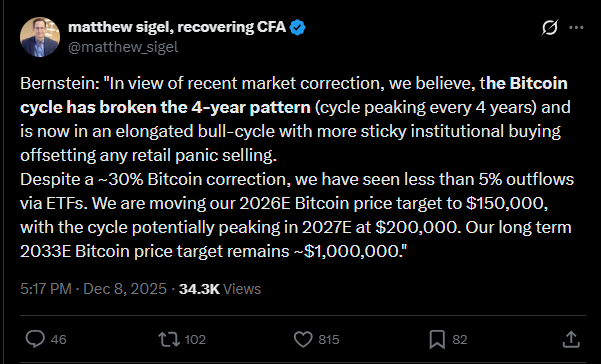 VanEck的Matthew Sigel分享的Bernstein新观点更是添了一把火:由于机构持续买入抵消了散户的恐慌,比特币周期已经“打破了4年模式”,在30%的回调期间ETF流出不到5%。他们现在预测到2026年底将达到150,000美元,2027年达到峰值200,000美元,到2033年将达到100万美元。