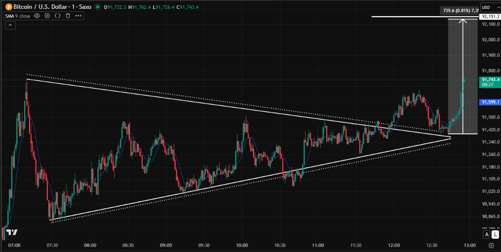 链上指标则描绘了更光明的前景。Glassnode补充道,随着活动激增,基本面和盈亏状况均有所改善,尽管随着价值轮动放缓,资本流动有所减弱。比特币兑美元价格维持在91,500美元上方,测试三角旗形态的上边界,正如@im_BrokeDoomer所强调的,此处的风险回报率以1:3的比例有利于多头。