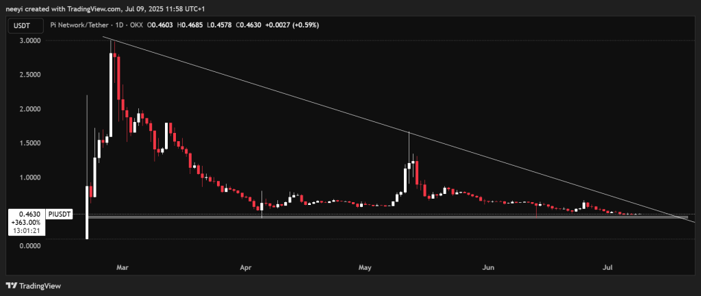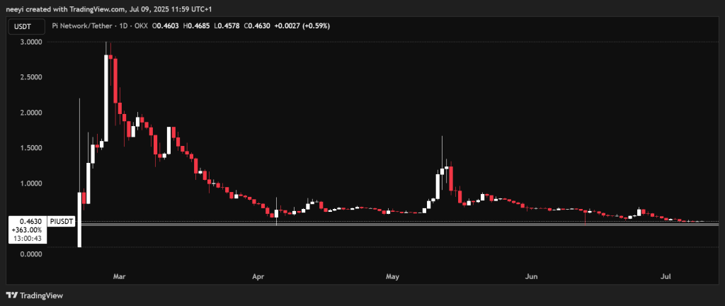 Pi币价格已从早期高点大幅下跌。当它在OKX等交易所上线时,Pi Network曾快速飙升至近3美元。但如今PI价格已跌至约0.46美元,跌幅超过80%,社区许多成员对项目短期表现失去信心也在情理之中。
