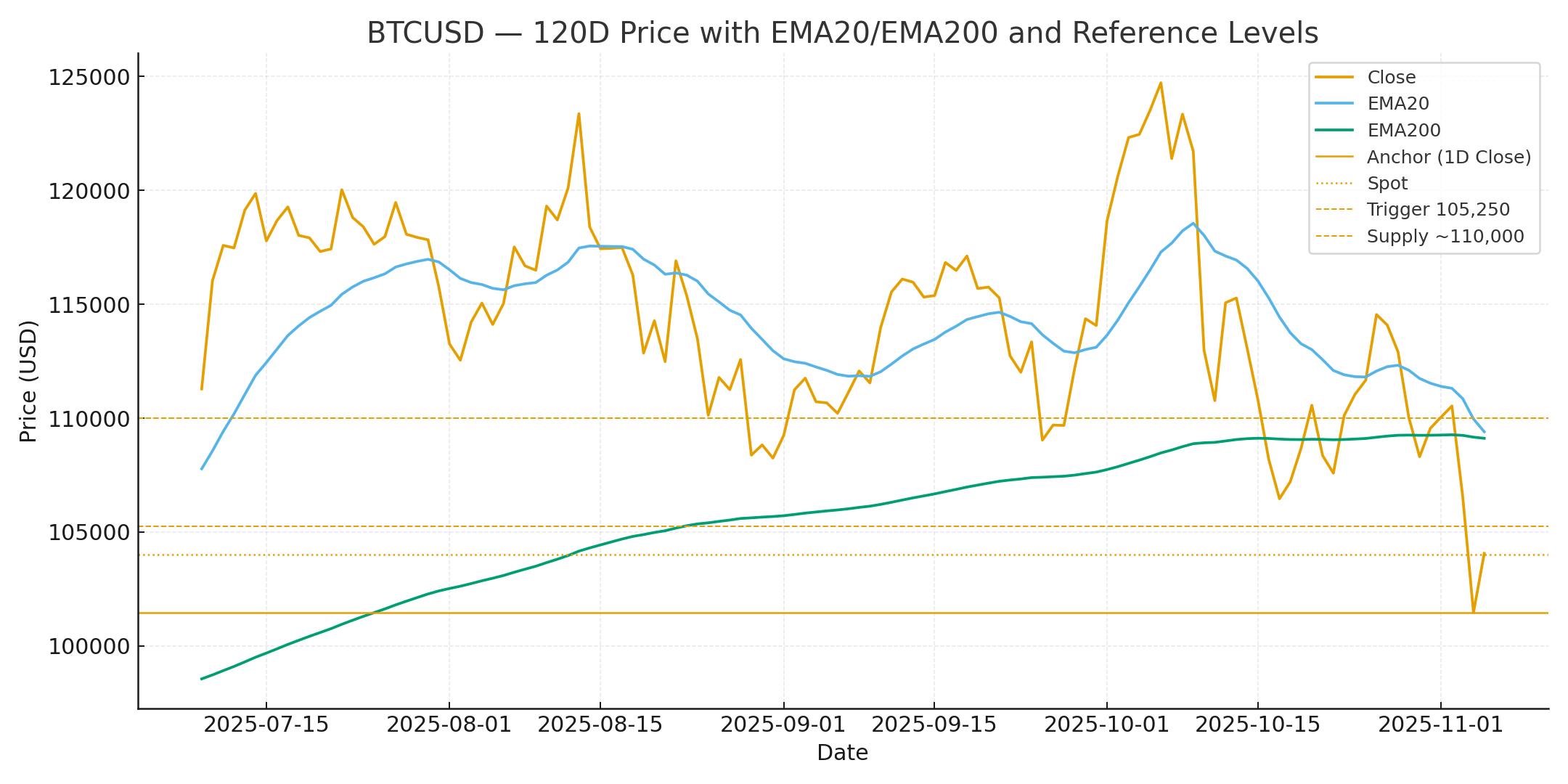 资金流向指标表明当前属于正常流动性交易时段,并未出现恐慌情绪。根据Coinbase现货数据估算,今日美元交易额约9.7亿美元,低于过去252个交易日90分位数的13.5亿美元——历史数据显示这种环境通常既不会引发强制去杠杆,也难以形成急剧的V型反弹。在波动率升高但未达极端水平的情况下,多头可能需要明确收复105,250-105,500美元区间才能激活趋势跟踪者的参与。