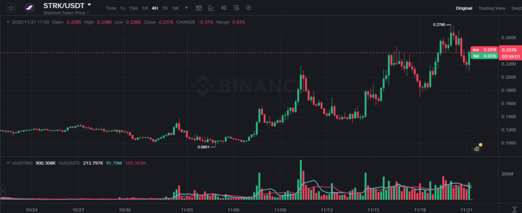 随着STRK再次测试该阻力位,结果仍不确定。若STRK未能突破该水平,可能会回落至较低支撑位。这样的回调可能会使价格更接近0.10–0.15区间,该区间此前曾观察到支撑。