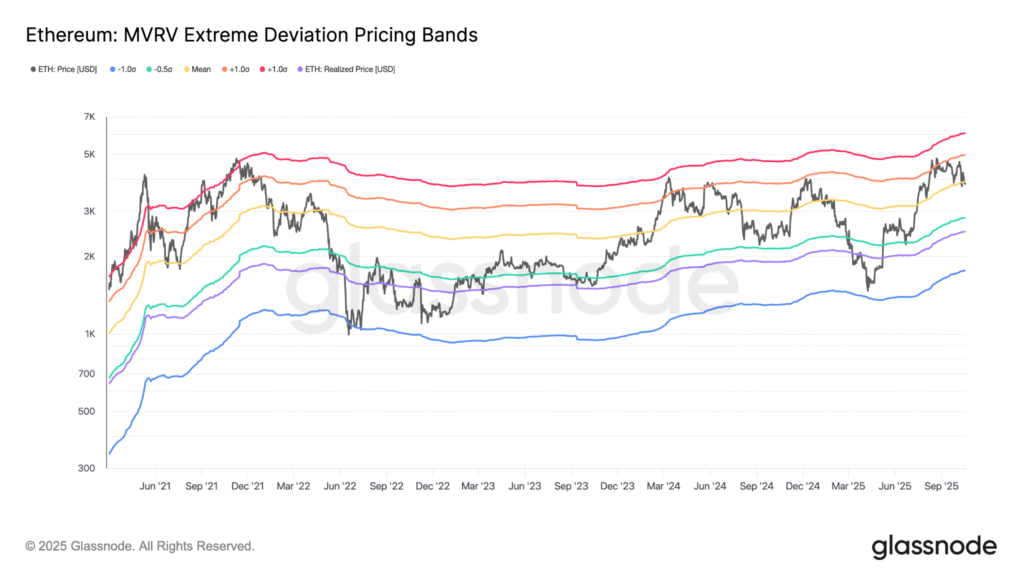 Glassnode的MVRV极端偏差定价带数据显示,以太坊回调已在3900美元均值带附近企稳。历史数据显示,该区域常成为新牛市动能的启动点。